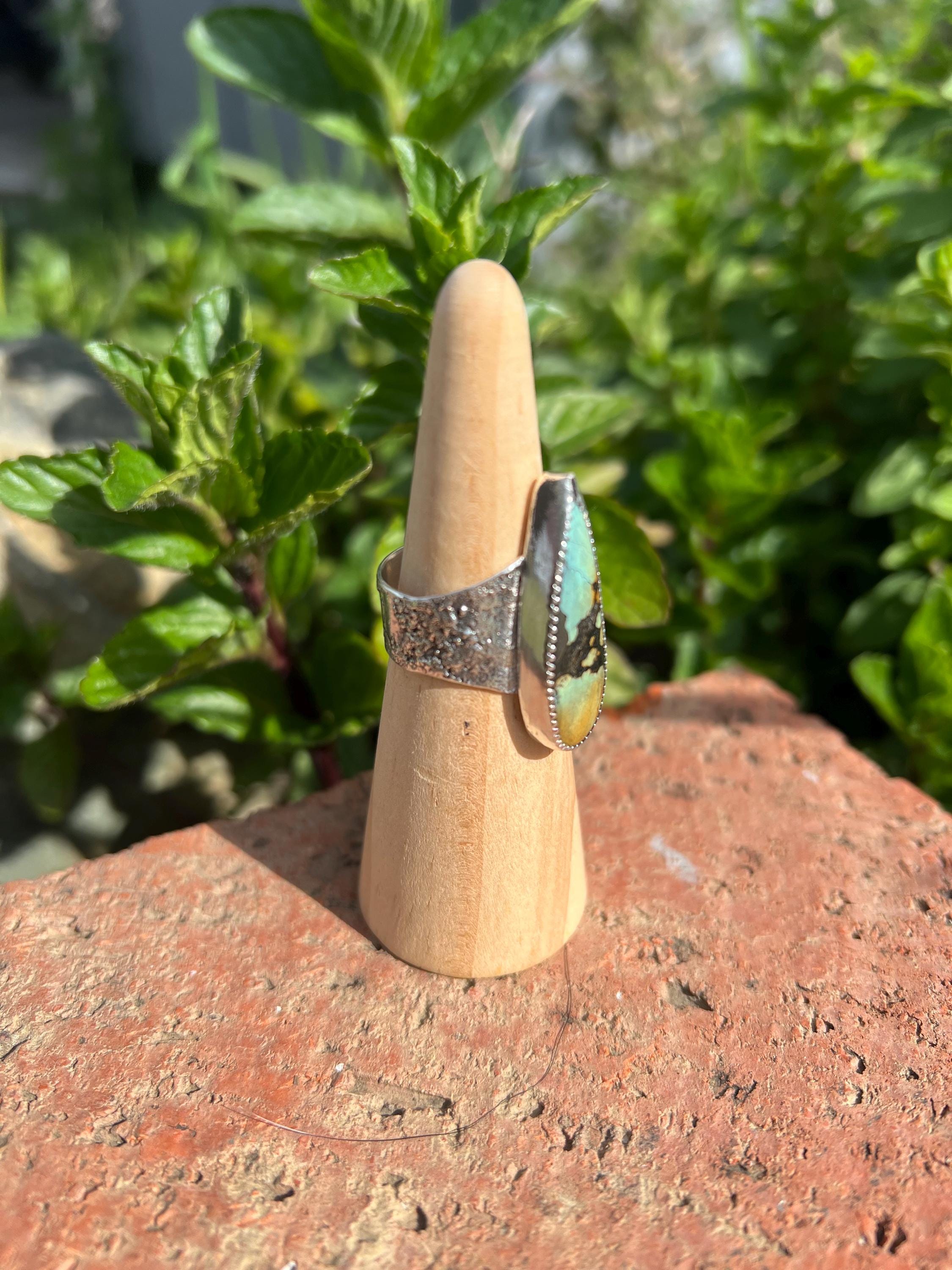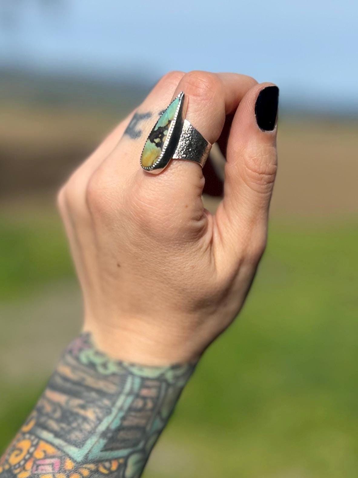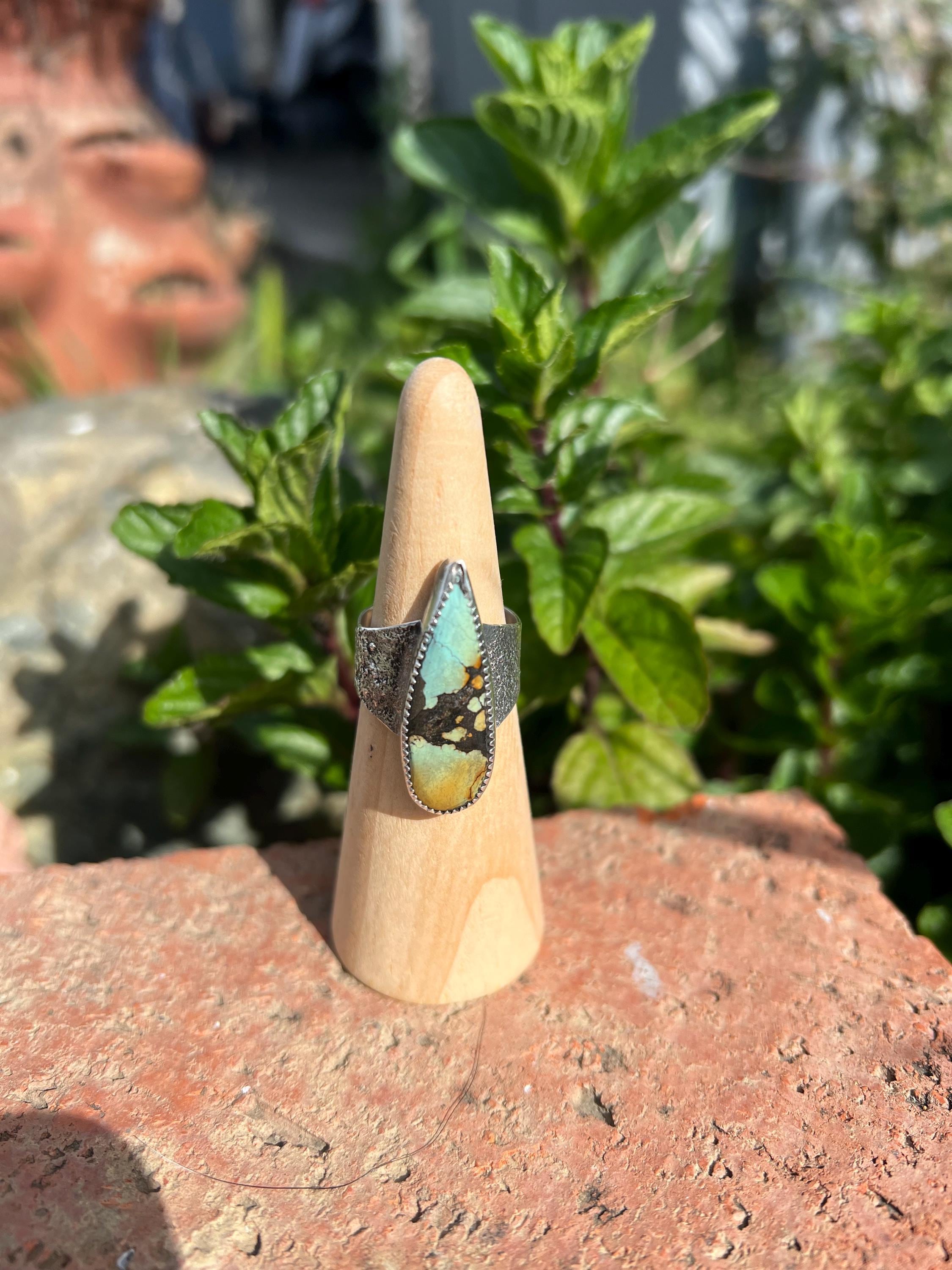 Handmade beautiful Hubei Turquoise sterling silver statement ring. Featuring a comfortable textured band. Please note that due to the thicker style of the band, this ring fits a little snug. I’d say more like an 8.5-8.75. This ring cannot be resized.