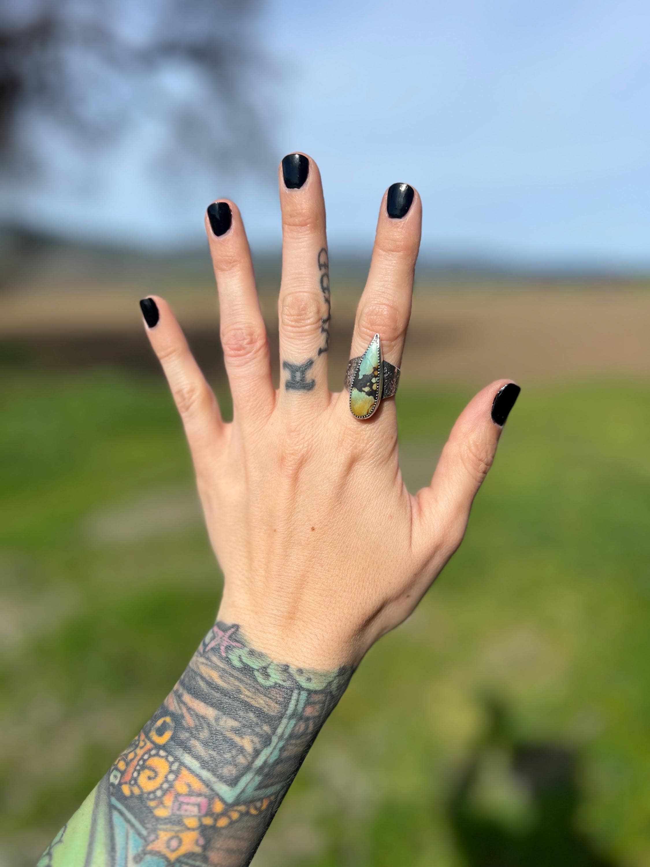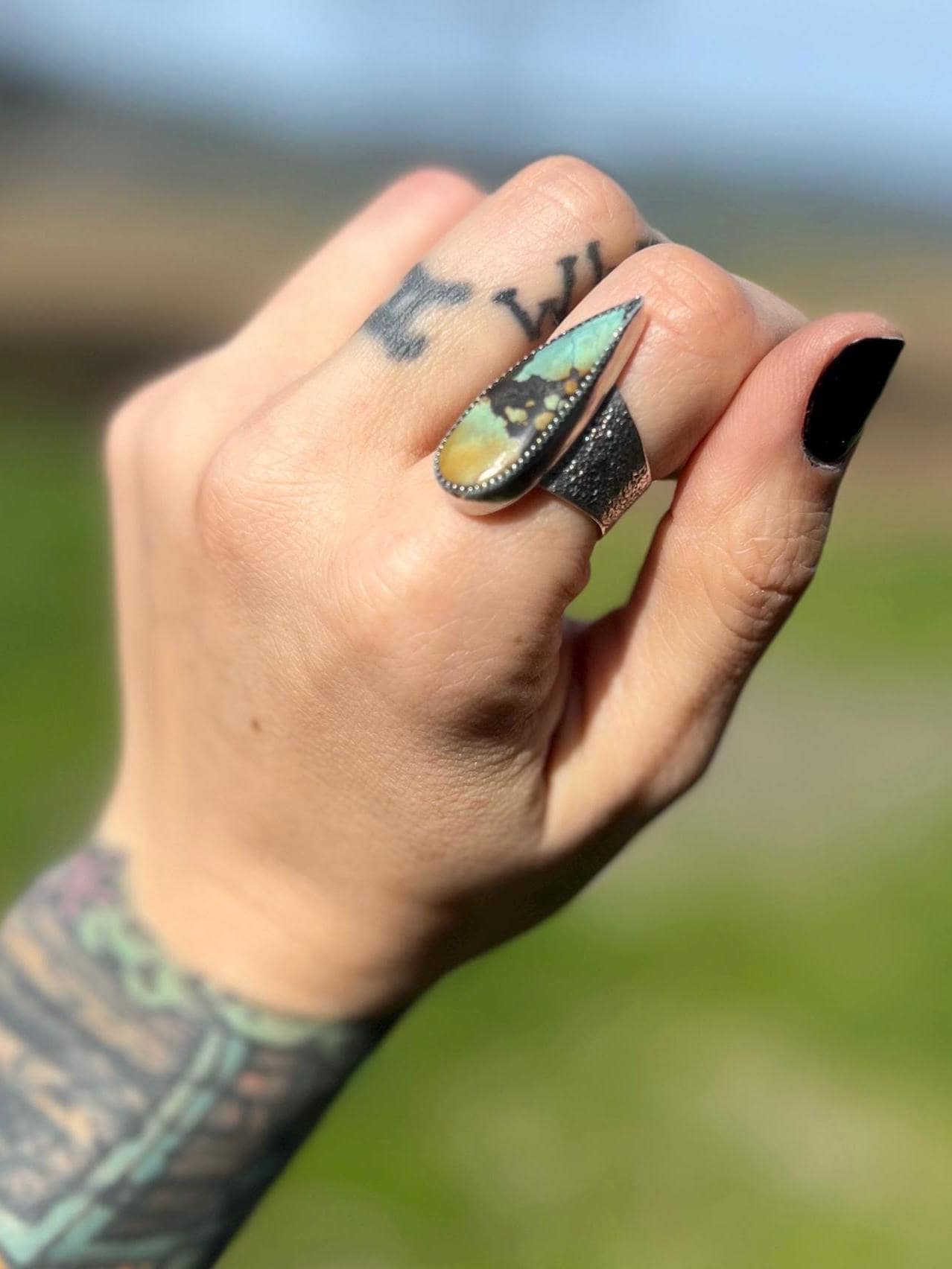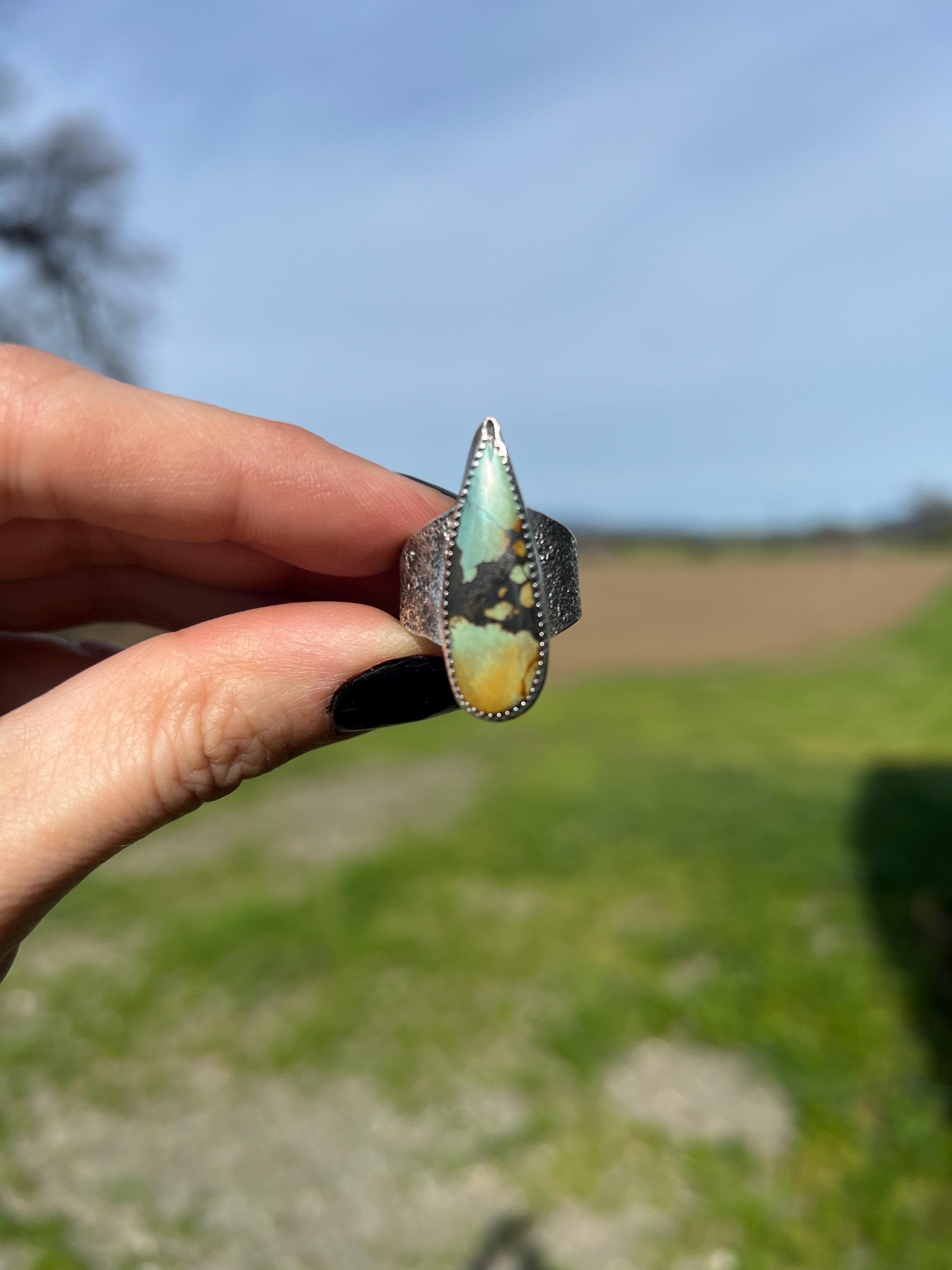 Handmade beautiful Hubei Turquoise sterling silver statement ring. Featuring a comfortable textured band. Please note that due to the thicker style of the band, this ring fits a little snug. I’d say more like an 8.5-8.75. This ring cannot be resized.